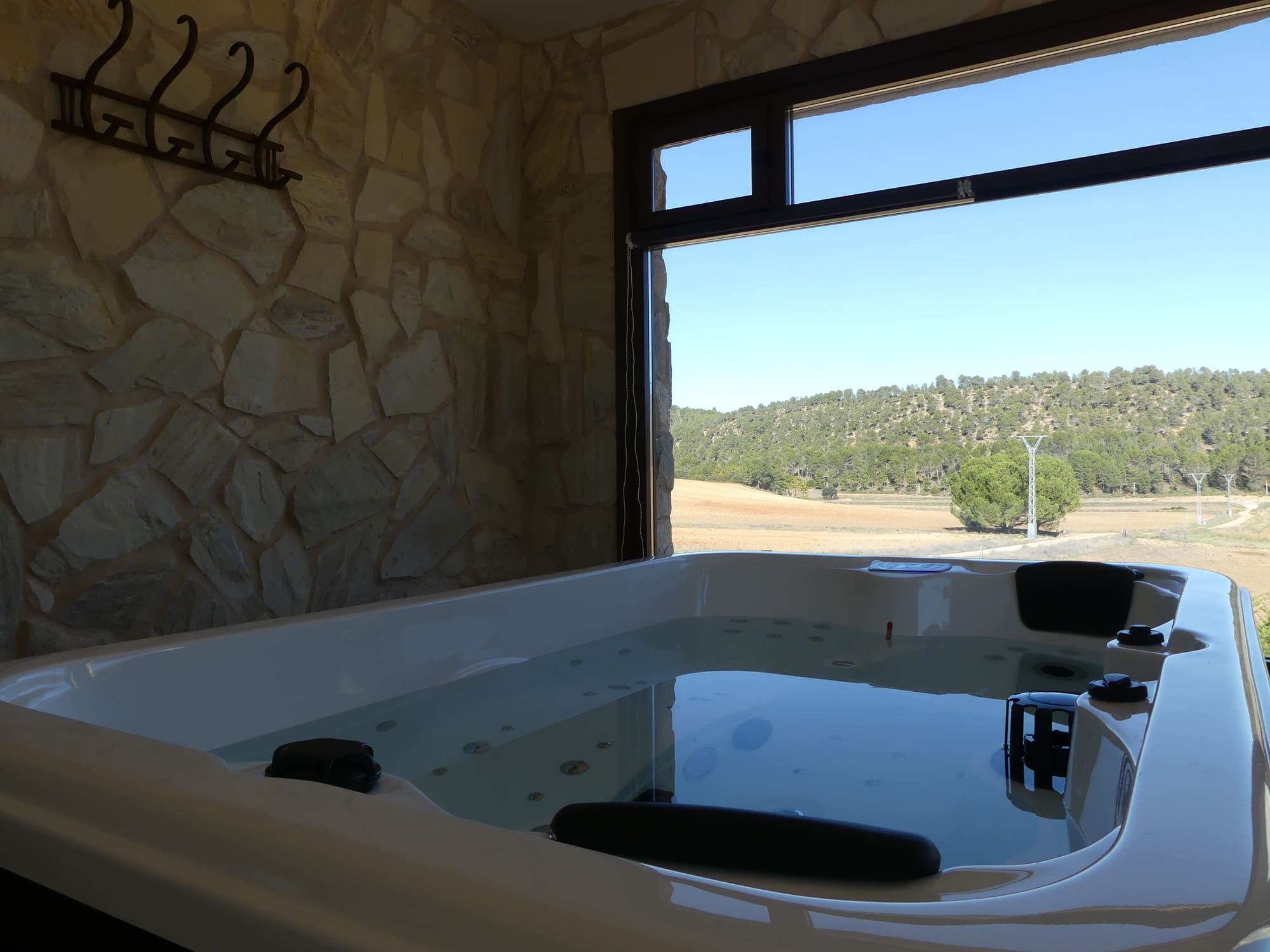 Casa entera. Aire acondicionado. Estufa de leña. Televisión. Jacuzzi (con suplemento). Piscina. Barbacoa. Electrodomésticos (lavadora, lavavajillas, horno, vitrocerámica, microondas, nevera-frigorífico). Se admiten mascotas. Vistas. Ducha.